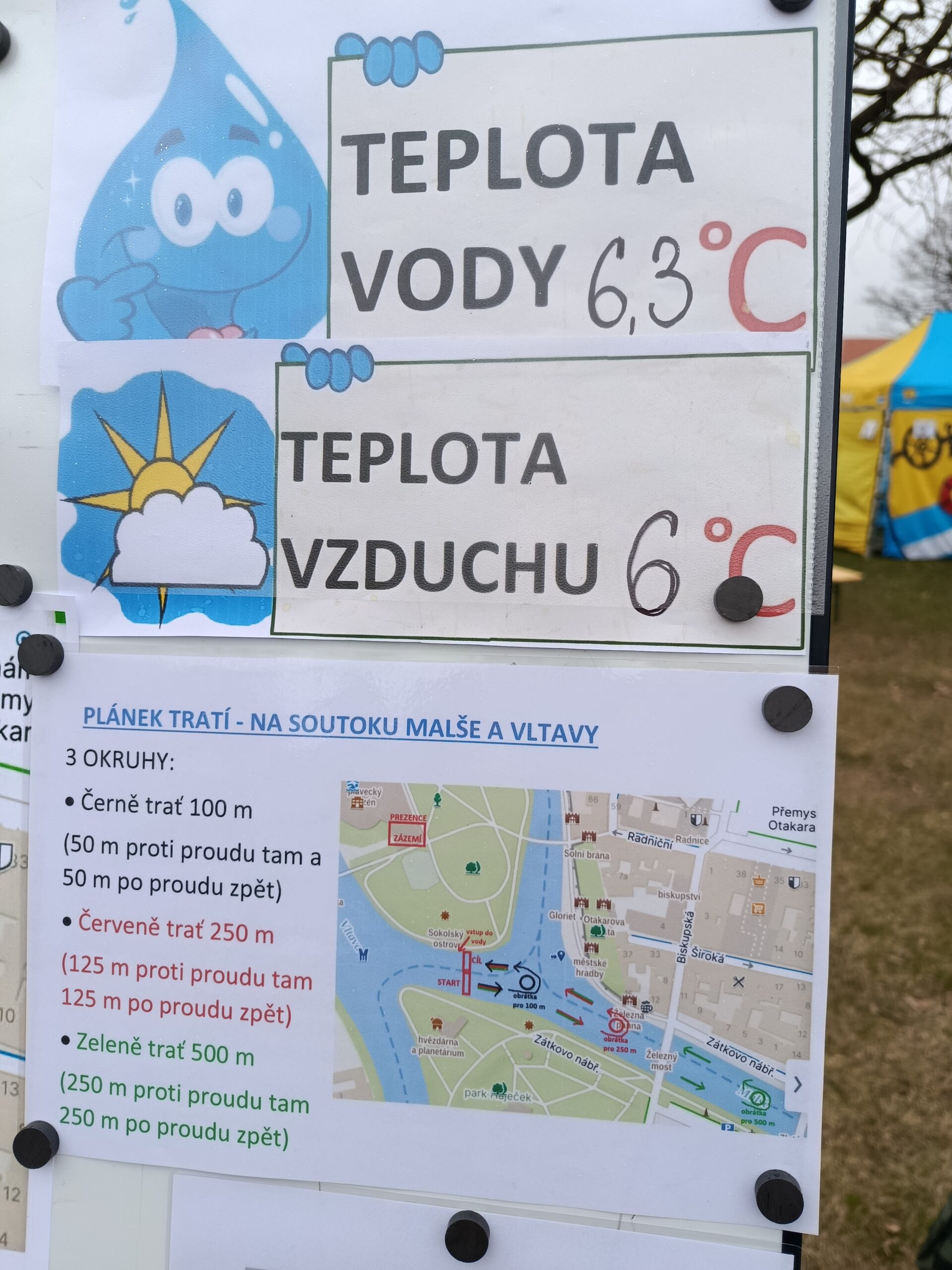 Do Českých Budějovic se sice jede na jih, ale v den závodu v sobotu 21. března 2026 tam bylo citelně chladněji než v Hradci. Voda v řece Malši měla 6,3°C a vzduch ani to ne. Navíc podstatnou část dne padal drobný déšť. Nikoho z osmi plavců SOHK to ale neodradilo a všichni jsme šli na tratě, na které jsme byli přihlášeni. Libor získal bronz na trati 1000m, Ema plavala 250m jako svůj první závod v chladné vodě a já jsem plaval hrozně pomalu a svých 750m nestihl v časovém limitu. Máme co zlepšovat a těšíme se příští týden do lomu Rumchalpa u Nové Paky.